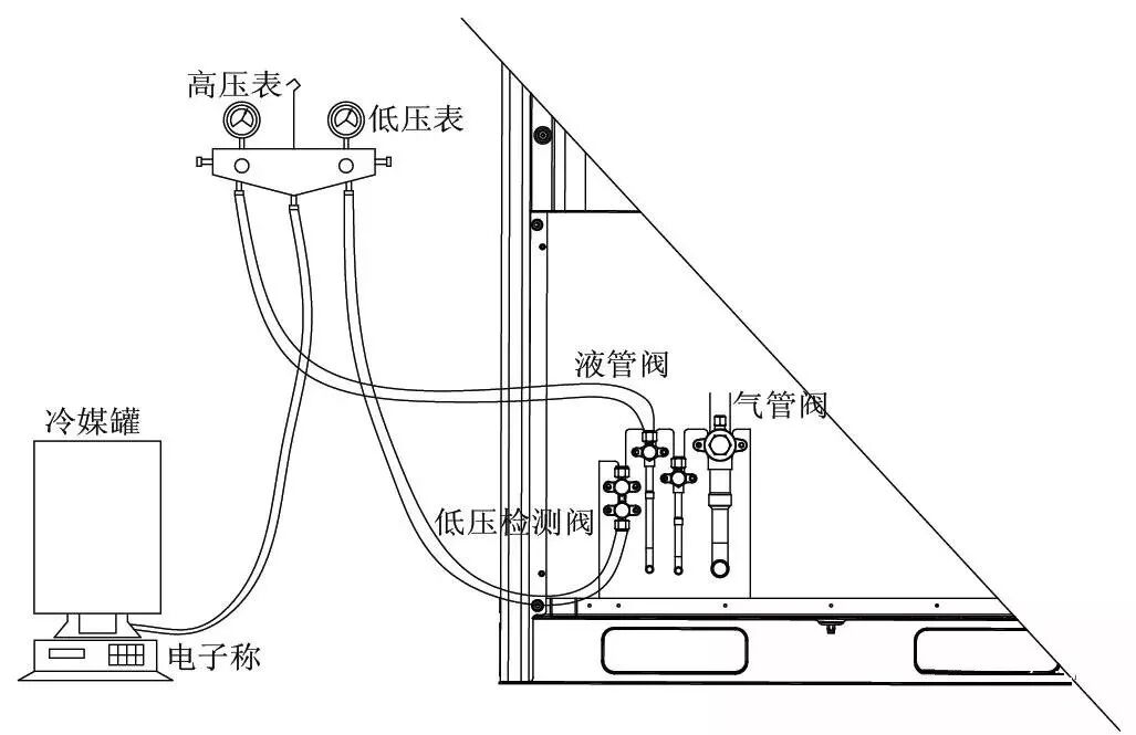 第一步:关闭冷媒罐阀门,重新连接压力表管。将低压表管从气管阀检测口拆卸下来,连接至低压检测阀(如下图);