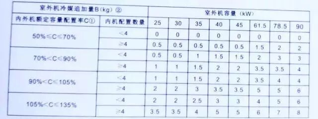 追加制冷剂量R= 配管冷媒追加量A+ Σ每个模块冷媒追加量B