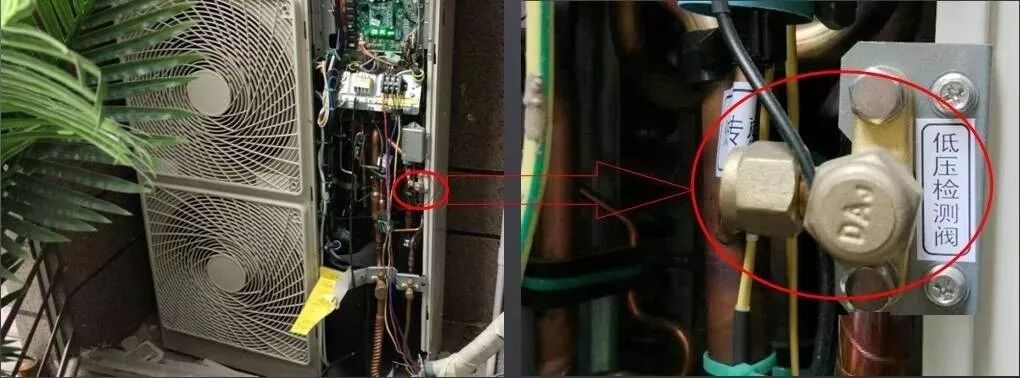 低压检测阀是一个独立的阀体,如上图,家用多联机也是一个独立的位于测出风主机的中下部(见下图),80、100、112主机的检测阀在侧板的左下角,拆开堵帽,接上软管,用冷媒排出软管内的空气,打开截止阀阀帽,用5mm的内六角打开阀芯,就可以对系统补加冷媒了,记得是液体定量补加,这个方法冬季和夏季都可以使用,尤其是主机在制热时,这里依然是低压,你现场留心观察一下,这根管道是不是连接在压缩机的回气口上。不会因为四通阀切换制热而影响到冷媒的补加和低压的测量。
