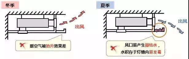 风口布置在灯槽内,制热时,如左图可看到热空气会被窝在灯槽内出不来; 最好的解决方案如右图,风口与灯槽齐平。
