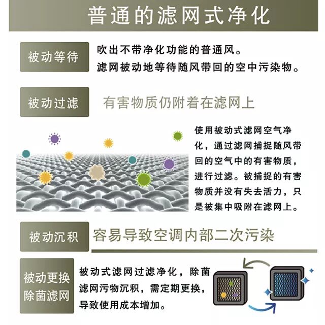 普通的滤网净化,容易沉积细菌病毒,一般每月需要清理一次,定期需要更换新的,使用成本增加不说,还容易造成空调内部污染。