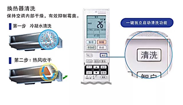 松下中央空调传奇新ET系列,在遥控器上具有独立的“清洗”按键,只需要一键启动,空调自己就会对附着在换热器上的污垢进行一段时间的清洗处理,当换热器水洗完毕后,制暖运转,热风吹干,可使空调内部保持干燥,以抑制霉菌病毒的繁殖。