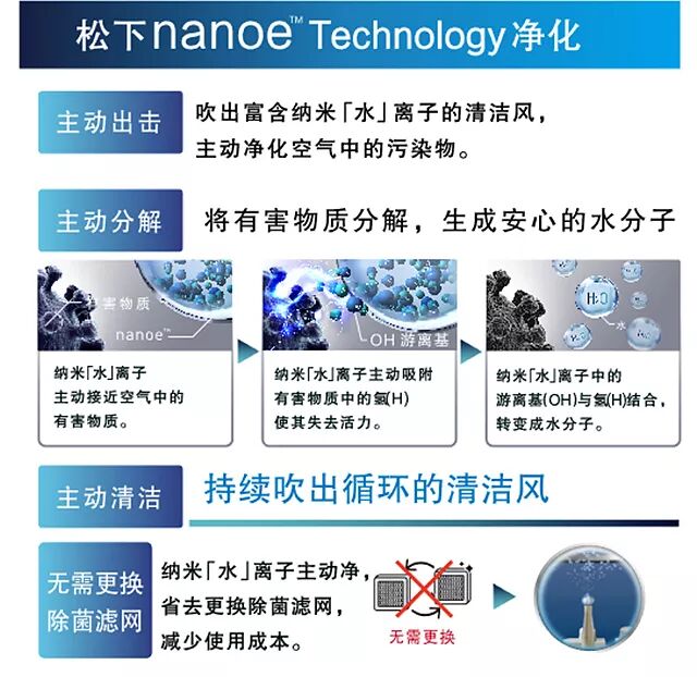 松下nanoe™Technology纳米水离子净化技术,与滤网的被动过滤对比,是主动出击。它每秒能释放4兆8000亿个纳米水离子,覆盖房间更远角落,从源头处分解空气中的有害物质。有了它,PM2.5、霉菌病毒、浮游菌、室内异味通通一键消灭,让你尽情呼吸每一口新鲜空气!重点是,还不用更换滤网,减少你的成本支出!