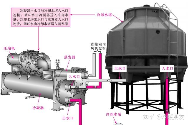 水冷冷水机组空调,是通过冷却水塔与冷却水泵协同作业,对水进行降温处理,进而使水冷机组中冷凝器内的制冷剂温度降低。降温后的制冷剂流入蒸发器,与循环水进行热交换,实现对水的降温。降温后的水被输送至室内末端设备(如风机盘管),与室内空气进行热交换,从而达成调节室内温度的目的。
