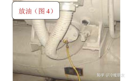 第4步:当上面的工作完成后, 关闭总电源, 进行放油。冷冻油在系统冷媒气体的压力下喷出的速度很快注意卫生不要喷溅到外面。在放油的同时排放冷媒, 打开高压力表截止阀 (图 4 )