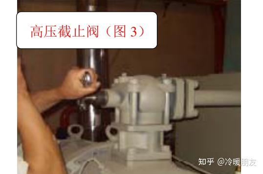 第3步:当机器低压压力小于 0. 1MP 时按下应急开关或关闭电源。由于压缩机排气口处有单向阀,因此制冷剂不会回流到压机, 但有时单向阀可能会关闭不严, 所以最好在按下应急开关的同时关闭压机排气的截止阀(图 3 )